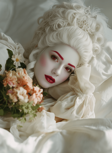 Use the person in the reference image, keep the background, lighting, facial features, clothing, pose, and actions unchanged. Remove the person's original hair completely and replace it with a tall, white, European classical aristocratic hairstyle with voluminous curls. Keep the face very pale, apply soft pink blush and eyeshadow. Make the eyelashes thick and dramatic. white face makeup covering original eyebrows completely, and replace them with thin, deep red eyebrows. Change the eyes to bright blood-red colored contact lenses. Apply cherry-colored lipstick with glossy water-effect lip gloss. Add subtle regal accessories fitting a White Queen Halloween theme.