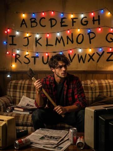 A cinematic, highly detailed scene featuring the person from the uploaded image sitting on an old, worn-out couch in a dim, cluttered 80s-style living room. The person has their real face perfectly preserved (100% face accuracy), messy, slightly wavy hair, and wears a flannel shirt over a plain t-shirt. They hold an axe firmly with both hands, looking tensely toward something off-frame. The wall behind them has a warm, faded brown/yellow retro background color with large black alphabet letters painted across it. Colorful Christmas lights hang over the wall, softly glowing in red, blue, yellow, and white, creating an eerie yet nostalgic atmosphere. The room is filled with scattered books, papers, soda cans, and old electronics. Cinematic lighting, soft film grain, and high-detail realism throughout.