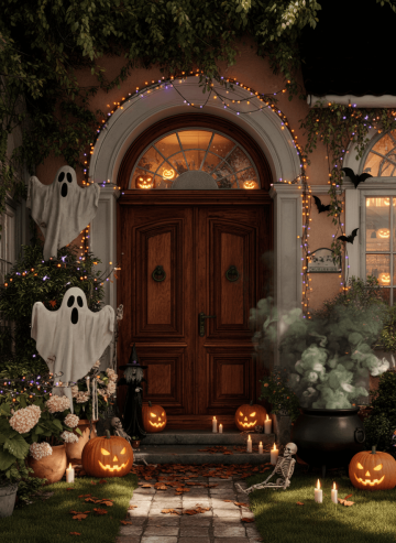 Keep the original house entrance, door, porch, and yard layout unchanged. Transform the scene into a dark, cinematic Halloween night with complete darkness outside the windows and no daylight. The outdoor area, porch, and yard are dimly lit, illuminated only by glowing pumpkin lanterns, flickering candles, warm string lights, and magical glows. Add exaggerated Halloween decorations naturally integrated: extra-large traditional white cloth ghost props with three black holes for eyes and mouth, placed on the lawn and leaning against stairs railing; a giant witch’s cauldron prominently placed, emitting thick, swirling smoke; oversized carved pumpkins on steps and yard; small skeletons scattered around; a witch doll on a chair or step; door curtains, window drapes, and other soft furnishings replaced with Halloween-themed designs (pumpkins, bats, spider motifs, orange/black/purple colors); scattered autumn leaves and cobwebs. If the door or windows have glass, subtly show the warm glow of indoor Halloween decorations such as pumpkin lanterns and string lights, visible through the glass without revealing full details, adding depth and immersive atmosphere. The overall atmosphere should feel spooky, cinematic, mysterious, immersive, and high-end, with layered shadows, soft orange glows, dramatic lighting, and enhanced Halloween horror vibe.