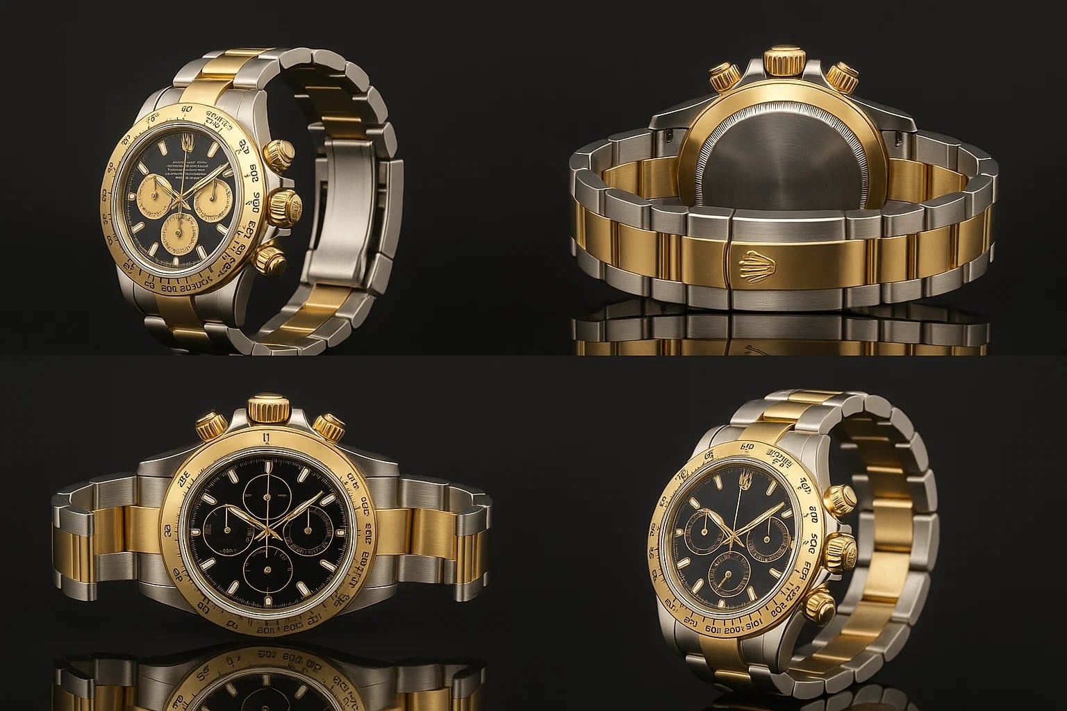 5. E-Commerce Product Prompt: "Generate a 360° view of a luxury wristwatch with gold details on a reflective surface, showing side, back, and top angles clearly."