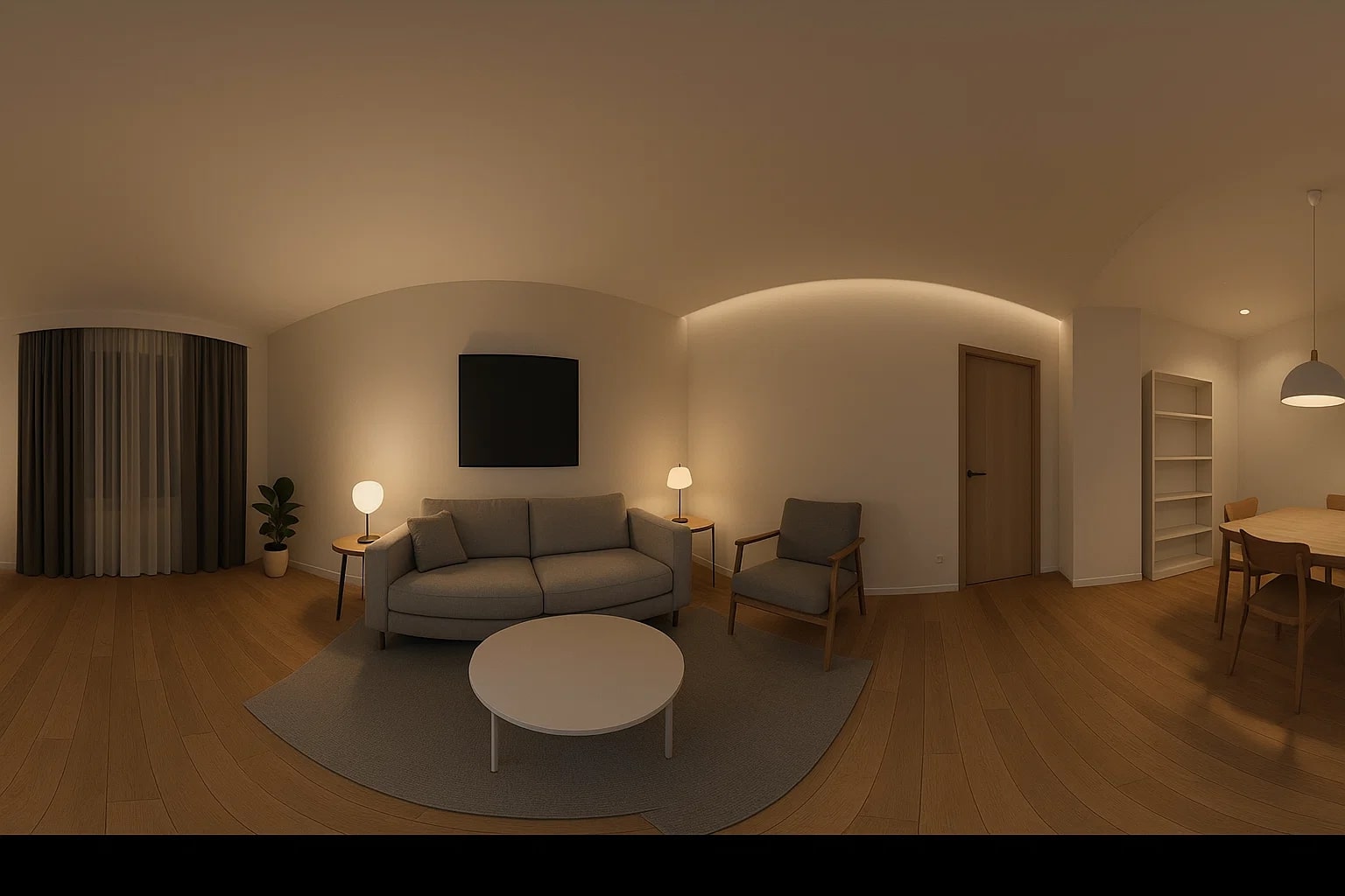 2. Interior Scene Prompt: "Create a 360° view of a modern living room with soft lighting, wooden flooring, and minimalist furniture, captured from multiple perspectives."