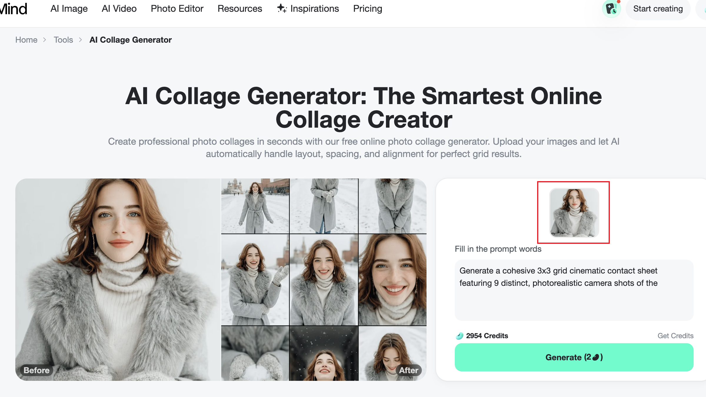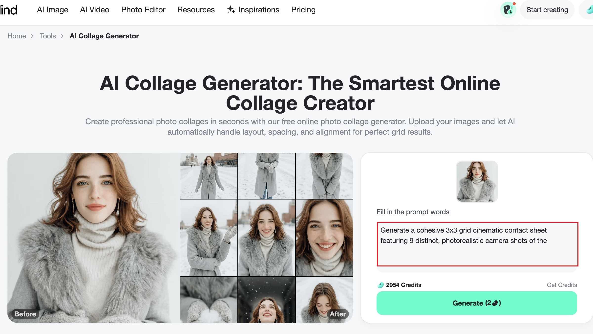 Creating a 3-grid or 9-grid collage with insMind's AI collage generator is fast and intuitive. Users upload the correct number of images and enter a short prompt. At the same time, the AI automatically manages layout, spacing, and visual consistency—even when images differ in lighting or style. You can also try insMind's AI 3×3 Grid Photo Generator or insMind's Photo Collage Maker to create collage creations.
