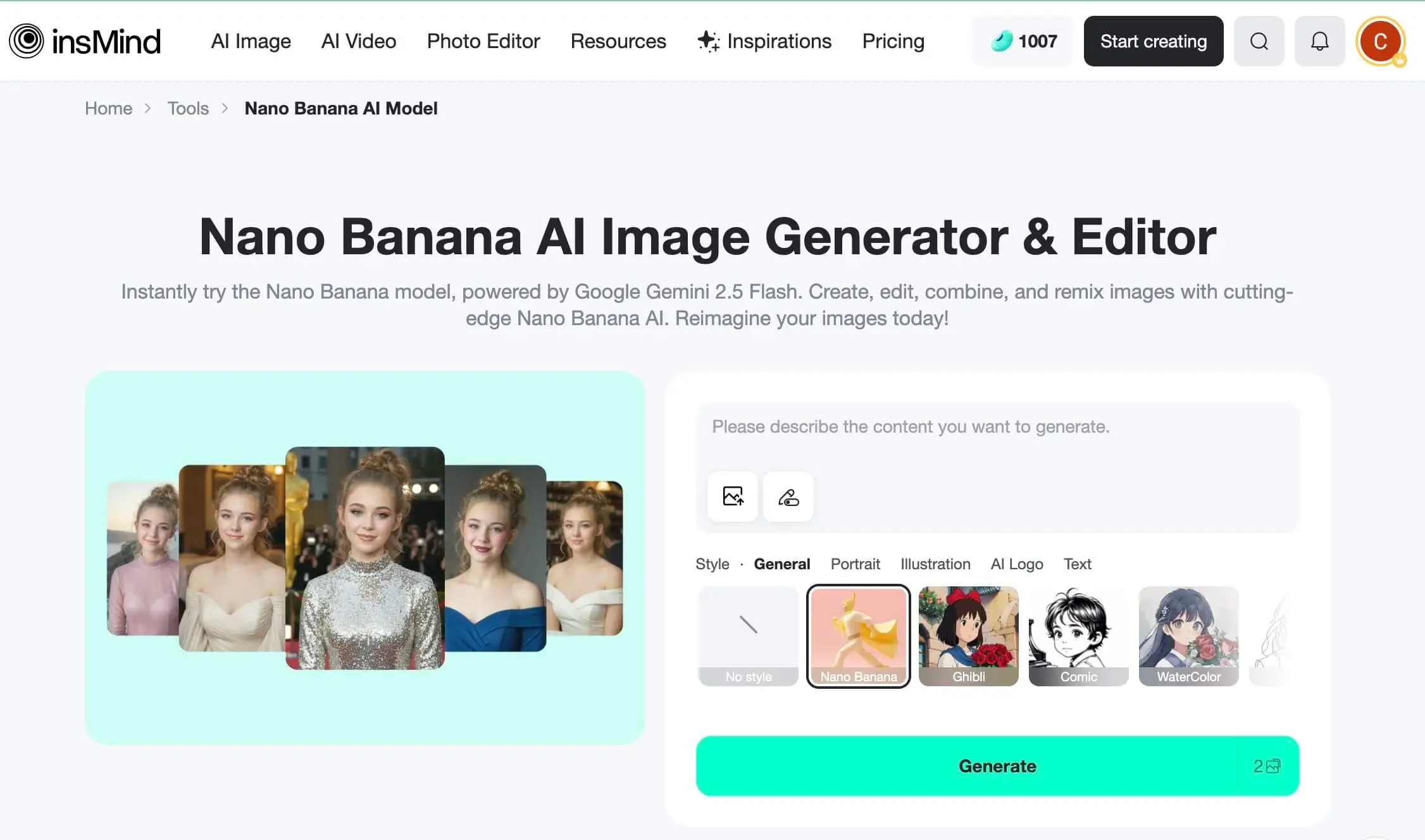insMind is a web-based, all-in-one AI image and video creation platform that offers user-friendly access to a wide array of creative tools. All we have to do is press a few clicks, upload reference content, and enter prompts to generate stunning visuals. The most exciting news is that insMind now supports Nano Banana AI model. You can use the same image generation experience on insMind.