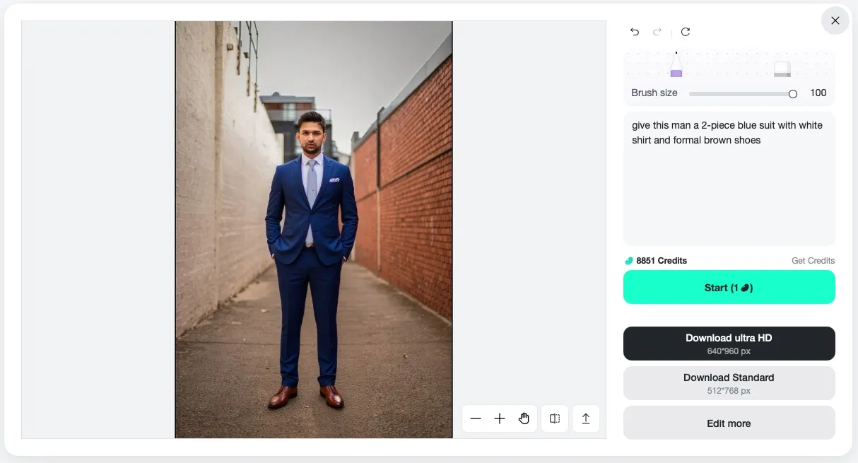 Utilize the brush tool to select the clothing zone that requires substitutions. This step helps AI to identify what sections of your garments require alteration and thus deliver genuine outfit modifications.