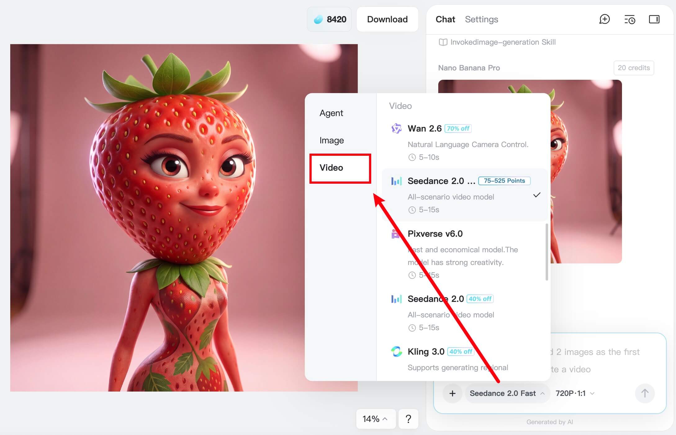 Want to take it a step further? Use insMind's video generator to transform your static image into a dynamic video, perfect for sharing on TikTok or Instagram. You don't need to download the image, and what you need to do is just switch the mode to video-generating mode. Select an AI model and enter your prompt, and the image will be turned into an AI fruit video in seconds.