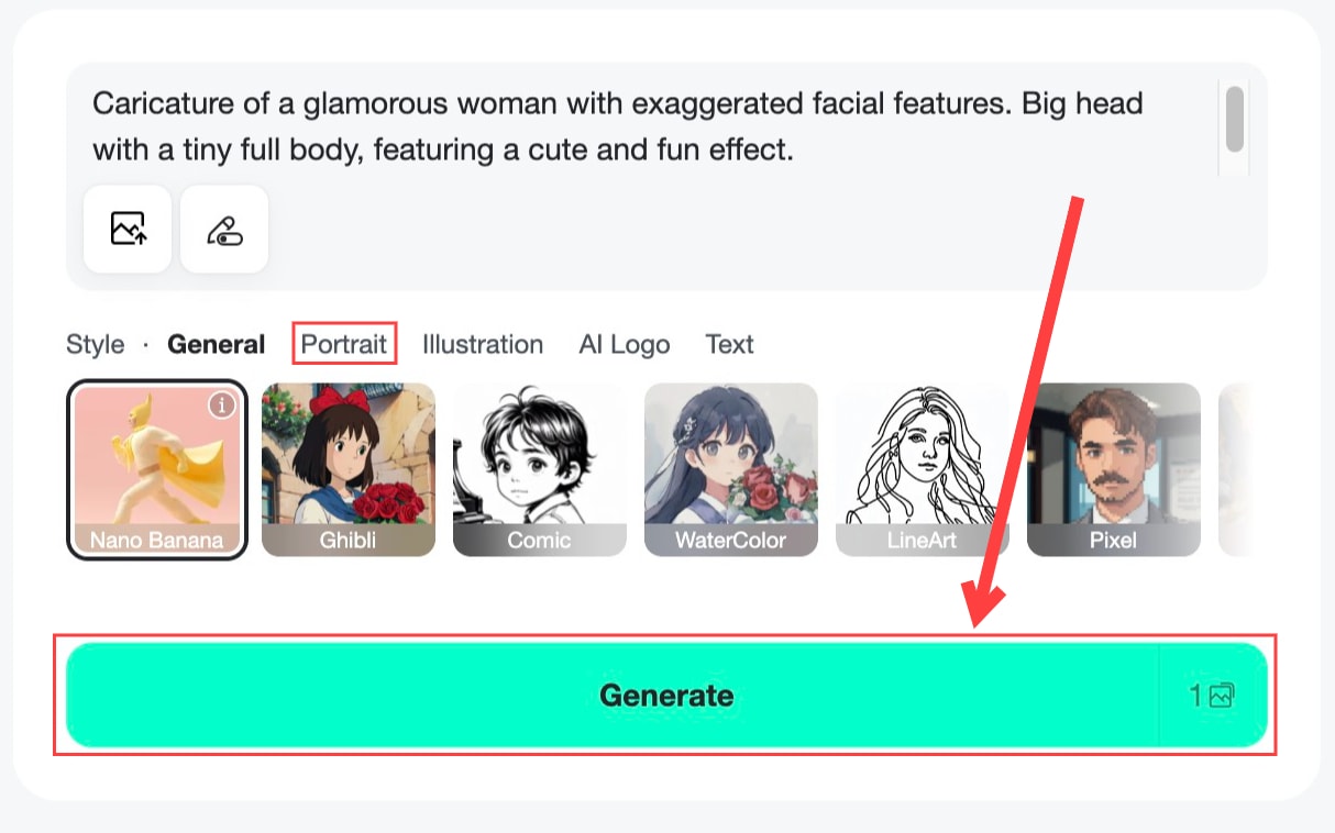 Afterward, under the prompt box, select a desired prompt from various "Style" tabs, like "General," "Illustration," or "AI Portrait." When chosen, hit the "Generate" button to start the conversion process.