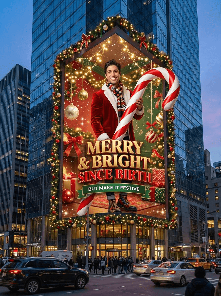A giant Christmas 3D billboard designed as a vertical long-strip screen on the side of a modern building in a busy urban street decorated with festive Christmas lights, garlands, and ornaments. Inside the 3D billboard is a Christmas-themed interior space, filled with warm red-green color accents, soft golden holiday lighting, subtle snow-sparkle reflections, and elegant Christmas decorations such as ornaments, ribbons, and festive patterns along the background surfaces. Within this Christmas-decorated space stands a cheerful person (from attached image, gender-neutral wording), fully positioned inside the billboard. They are wearing a festive Santa-inspired outfit with a modern twist — red velvet jacket, playful patterned scarf, stylish boots. They hold a giant candy cane that slightly extends out of the 3D billboard, creating a playful breaking-the-frame illusion. Next to them, bold text styled like a luxury holiday slogan reads: “MERRY & BRIGHT SINCE BIRTH” with tagline “BUT MAKE IT FESTIVE”. The 3D billboard mixes high-fashion elegance with joyful Christmas humor. Photorealistic, stylish, culturally modern, and meme-inspired.