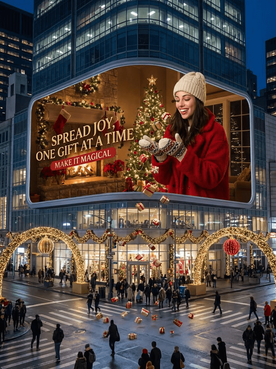 A giant Christmas curve-edge horizontal long-strip 3D anamorphic billboard on the side of a modern building at a busy crossroad, streets decorated with Christmas lights, garlands, and festive ornaments. Inside the wide 3D billboard is a cozy Christmas-decorated living room scene — warm fireplace glow, decorated tree, stockings, red-green holiday accents. In this scene stands a woman (from attached image) dressed in a cozy winter-chic outfit — oversized red coat, patterned mittens, wool hat. She’s playfully tossing tiny wrapped presents that appear to float off the billboard and land on the street below. Next to her, bold text styled like a luxury holiday slogan reads: “SPREAD JOY, ONE GIFT AT A TIME” with tagline "MAKE IT MAGICAL". The 3D billboard mixes high-fashion elegance with whimsical anamorphic style. Photorealistic, stylish, culturally modern, and meme-inspired.