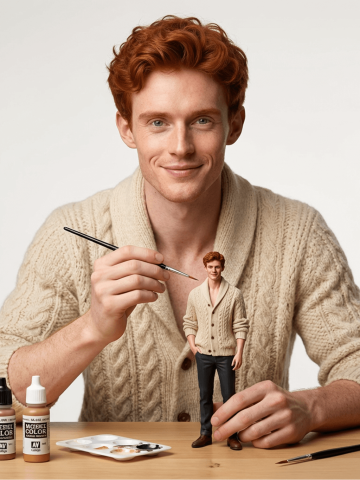 Refer to this photo and maintain the consistency of the characters.Create an image of this person as an artist painting a tiny miniature figurine version of themselves. looking directly at the camera with a confident expression while holding a tiny paintbrush in one hand. The small action figure-sized version of themselves is prominently placed on a clean workbench in front of them - make the miniature slightly larger and more visible than realistic scale so it clearly stands out. The doll is a complete body.The miniature figure is also wearing the same iconic outfit in a signature pose. Minimal art supplies on the workbench to avoid clutter - just 2-3 small paint bottles and one extra brush, keeping the focus on the person and their miniature. Soft neutral white background, professional studio lighting, shallow depth of field. The composition emphasizes the person’s face looking at camera and the miniature figure they’re working on. Clean, uncluttered, photorealistic style with high detail on both figures