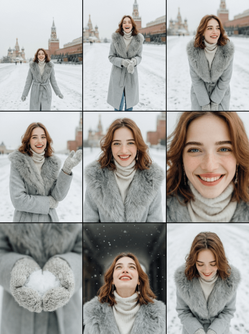 Generate a cohesive 3x3 grid cinematic contact sheet featuring 9 distinct, photorealistic camera shots of the subject(s) from the input image. Location & Setting: Set the scene at the following coordinates: Latitude: 55.7558° N, Longitude: 37.6173° E. The environment must accurately reflect the specific location, local time, and weather. Emotional Theme: The overall emotional theme for the 9 shots is: [fun / joy / bittersweet / calm / curious / determined etc. – write the desired emotion here]. Each shot should subtly reinforce this theme. Style & Emotion: The 9 shots must maintain a consistent, dramatic, and emotionally profound mood. Subject's facial expressions must dynamically adapt to the narrative emphasis of each unique perspective, while strongly conveying the overall Emotional Theme. 9 Shot Coverage (Focus on Content & Angle): Full Environment View: Subject small in a vast, atmospheric environment. Full Body Shot: Entire subject visible, emphasizing presence against the backdrop. Mid-Body Shot: Knees-up view, capturing an emotionally charged stance. Upper Body Shot: Waist-up; focus on expressive posture and interaction. Intimate Chest-Up Shot: Chest-up; intimate framing, highlighting the gaze and inner feeling. Tight Face Shot: Close-up on the face, clearly conveying a specific, unstated emotion. Macro Detail Shot: Extreme close-up on hands, texture, or eyes, revealing a narrative element. Upward Gaze Shot: Looking up from below (worm's eye view); emphasizing quiet power or resolve. Downward Gaze Shot: Looking down from above (bird's eye view); suggesting reflection or vulnerability. Strict Constraints: Maintain strict consistency (same subject, clothes, lighting) across all 9 panels. Depth of field must shift realistically (bokeh in close-ups). Absolutely NO text, logos, labels, watermarks, symbols, numbers, letters, or typography should appear in any of the 9 generated images.