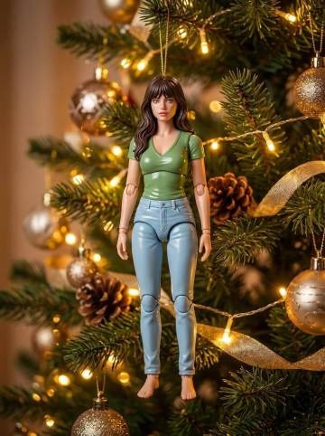 Use the subject from the uploaded photo and transform them into a 1/18–scale commercial collectible action figure, fully articulated. Keep the pose, hairstyle, clothing, and proportions recognizable. Render the figure in high-gloss molded plastic, with smooth, shiny surfaces and precise sculpting typical of premium collectible figures. Hang this 1/18 action figure on an indoor Christmas tree using a thin golden string like a Christmas bauble. The scene is warm and festive, filled with golden lights, ornaments, and a cozy Christmas glow. Ensure the figure has a strong toy-like presence, integrated naturally with the tree branches, and keep the image clean, clear, and focused on the ornament.