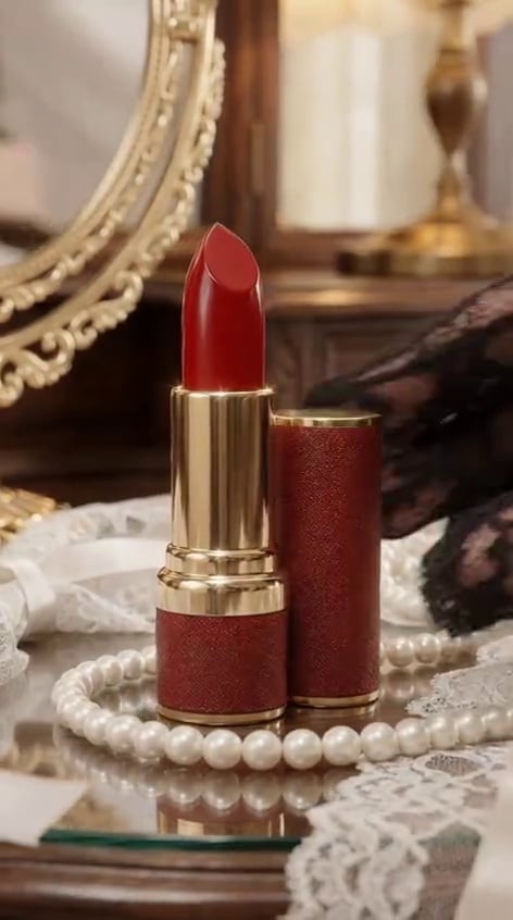{ "scene": { "type": "product_showcase", "setting": "luxurious vanity table with ornamental items", "lighting": "warm, cinematic, dynamic highlights and shadows", "camera": { "movement": "smooth rhythmic orbit around the stationary lipstick", "perspective": "close-up, focused on the lipstick", "lens": "shallow depth of field" } }, "subject": { "object_type": "lipstick", "interaction": "at the end of the shot, a hand wearing black lace glove reaches and picks up the lipstick, taking it out of the frame" }, "audio": { "instructions": "soft, elegant instrumental music plays throughout the scene, no dialogue" }, "mood": "warm, cozy, cinematic storytelling, luxurious" }