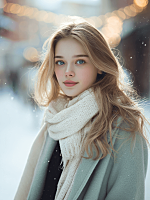 Please process each person exactly as they appear in the uploaded photos - maintaining their facial features, hairstyle, race, posture and proportions.Create an 8K vertical triptych consisting of three equally wide horizontal panels, seamlessly joining the three panels together, showing all the original characters. Overall scene: An empty ground covered with thick snow, clear footprints, a dark, silent and empty background. On the right side of the picture, there is a tall, warm yellow street lamp. Strong wind and snow dynamic, large snowflakes flying diagonally, creating a romantic atmosphere of a winter night, with a quiet and romantic cinematic feel.Character clothing: Woman: Light-colored long coat + same color pants + beige knitted hat. Man: Dark-colored long coat + dark-colored pants.Use a 35mm/50mm standard fixed focus as the main method, with a sensitivity of 400, aperture of f/2.8, shutter speed of 1/180 seconds, balancing both the environment and the details of the characters, with natural perspective.Light and atmosphere: The overall color tone is cold, with a warm color light source. The light is soft, and the snowflakes form light spots under the light, creating a contrast between the cold snowy ground and the warm light. Scene 1 - Medium shot Frontal view, fully capturing the full body dynamics of the charactersAction: The two are holding hands and running forward, the woman's arms are naturally spread out, the body slightly leaning forward, full of vitality; the man is holding the woman. Scene 2 - Close-up shot Action: The two are tightly embracing, facing the camera, the expressions of both are happy.Background blurring Scene 3 - Subjective shot Foreground (man): Only the back and shoulders are presented, the hair and shoulders are covered with snow, the gaze is directed towards the woman in the distance.Background (woman): In the distance, the whole body, arms spread out, light steps, smiling and looking back at the man, a lively posture