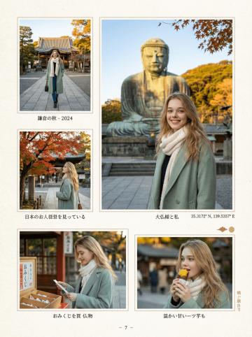 Create a single page photo collection from a high-end Japanese photobook scan featuring 5 photos of a woman at the location with latitude and longitude 35.31721720077321, 139.5357227423284, matching the local current time atmosphere and real-time weather. Make the specified character blend in naturally as if sightseeing at that location. Arrange the 5 photos in varying sizes with a beautifully designed, album-style layout, without showing any photobook or album background—only the single curated photo page. Do not display any explicit year, date, or timestamp; only reflect the atmosphere.