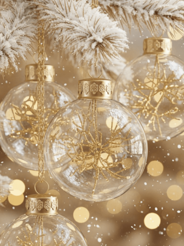 In a close-up shot, several transparent glass Christmas balls are hung on golden pine branches covered with snow. Inside the balls, there are exquisite golden branch textures, and on top are metal caps with patterns. The background features warm golden light spots and fine snowflakes, presenting an overall hyper-realistic photography style. The picture is filled with a light luxury and dreamy Christmas atmosphere, highlighting the characteristics of exquisite Christmas decorations and winter romance. no text
