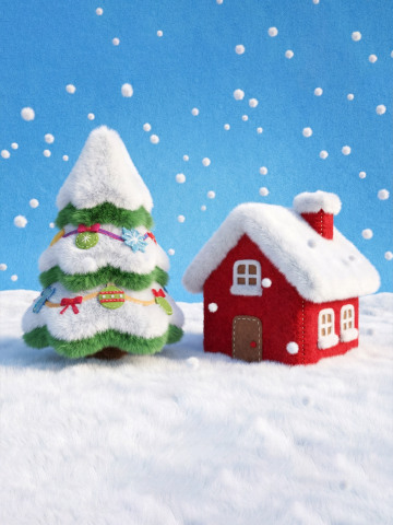 3D rendering of a miniature stylized winter scene inspired by creative typography design, without any text or letters. A snow-covered Christmas tree stands next to a small red house, surrounded by gently falling snowflakes, under a bright blue sky. All objects rendered with detailed plush textures: fluffy, dense, soft fur, felt details on roofs and tree ornaments, subtle stitching and pile variations visible. Bright, vivid colors with strong contrast, high saturation, and clear, crisp details. Natural lighting enhances soft shadows and gentle highlights on plush surfaces. Consistent visual style across all elements, emphasizing texture richness and intricate material details. High-resolution, finely detailed rendering.