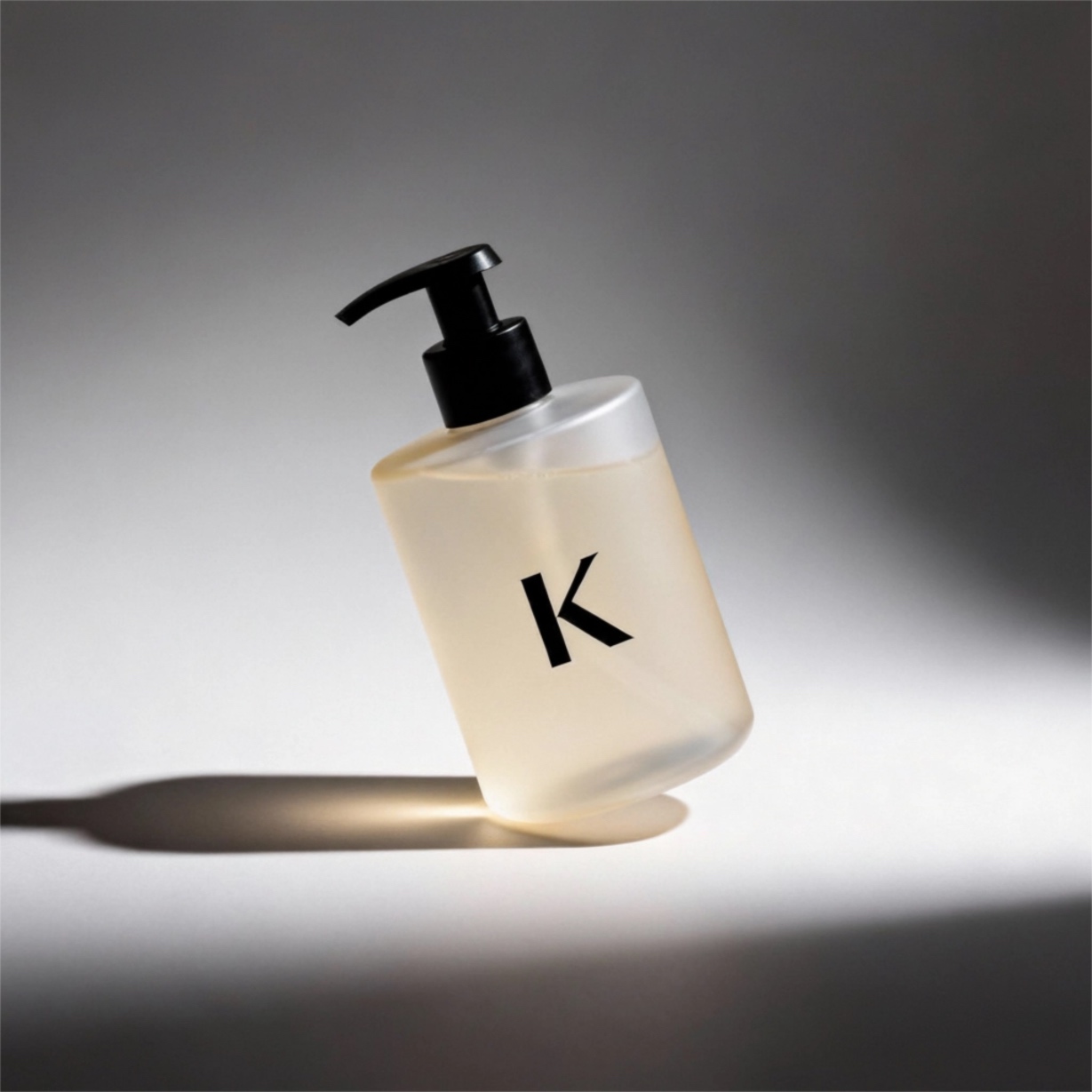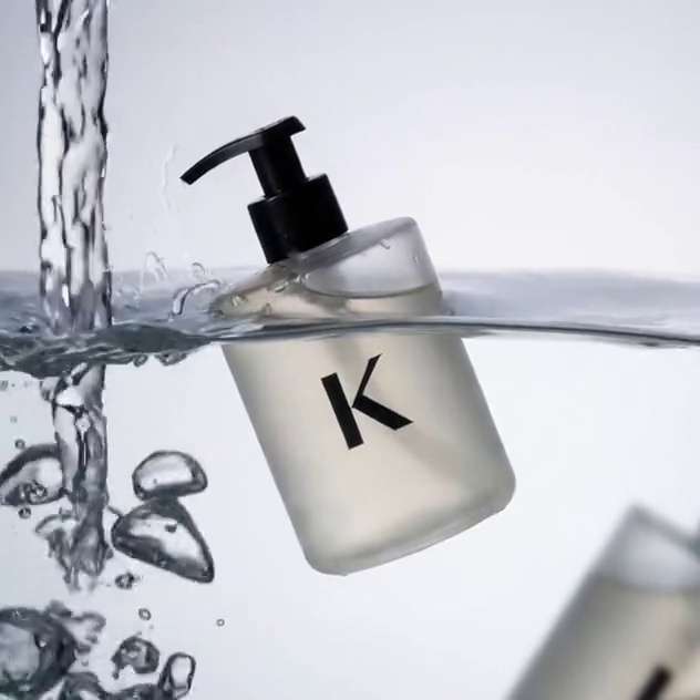 The camera slowly pans forward, and a transparent water column slowly pours in from the upper left corner, forming a fine stream of water. The bottle collides with something, causing tiny water splashes to fly up. Bubbles adhere to the bottle and slowly float upwards. The product sways slightly in the water along with the water flow, and there is a clear sound of the flowing water.