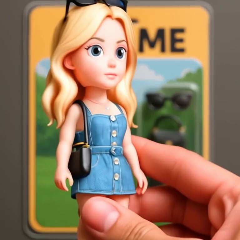 In the picture, a hand is extended, picking up the figurine in the image. It is brought close to the camera, examined from left to right, and the camera focuses on the figurine that has been picked up.