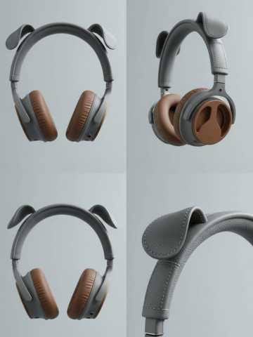 Based on the picture, output the front/back/side views and a close-up of the ears. Combine the four pictures into one