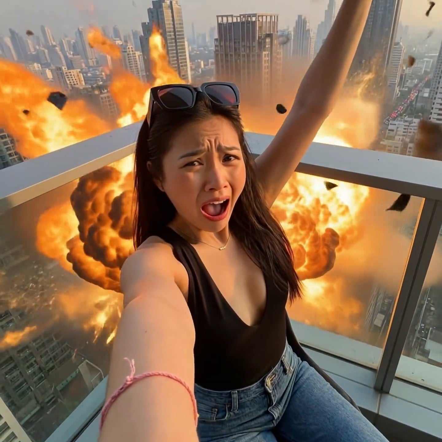 Lock-off camera, slow motion, disaster-film polish, 8K resolution. A spectacular explosion erupts inside the building behind the character (captured in slow motion). As it blows, a wall of fire rises in the background; blast paths align with the building’s silhouette, layered flame effects stack in depth, and windows shatter. The blast escalates into a massive fire—everything behind the subject is ablaze. Orange flames and countless sharp shards of masonry jet outward, filling the frame with burning fire. Small black fragments and splashing flame sweep forward, wrapping around the character and overtaking the screen. Subject focus: The camera stays locked on the lead in the foreground. When the explosion hits, dynamic orange–yellow rim light convincingly lights their face, shoulders, and arms, with intensity pulsing in sync with the flames. Micro-expression: A seamless shift from a raw, instinctive reaction to abject terror—brows knit tight, fear in the eyes, a slight tremor, hands instinctively lifting.