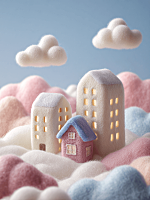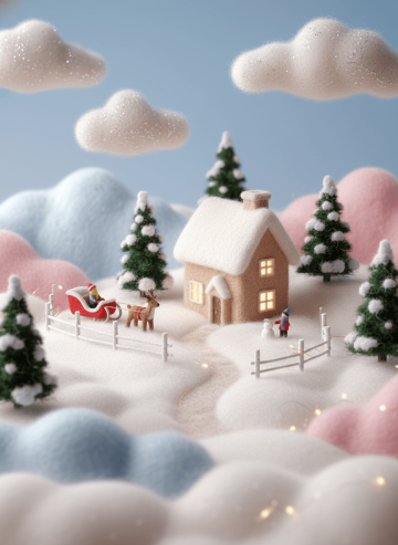 Refer to the style in the image to generate a miniature Christmas landscape: A felt miniaturized winter rural scene