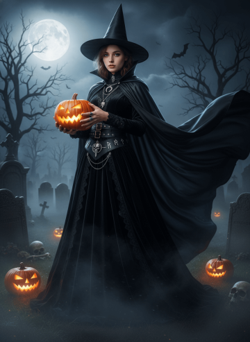 Use the female person in the image, keeping her original facial features exactly the same as in the reference image — preserve her eyes, nose, mouth, and overall face structure. Change only the clothing, pose, and background. Dress her in a gothic witch-style gown — black velvet or leather long skirt, flowing and elegant, with high-collar cloak, metallic details, lace, and rune belt. The cloak is flowing in the wind, adding motion and storytelling. Add gothic accessories such as rings, necklaces, silver pendants, or a pointed witch hat. She is holding a glowing orange jack-o’-lantern. The person is looking at the camera with a direct gaze. The background is a dark European graveyard at night, with tombstones, bare trees, mist, and cold moonlight. Several jack-o’-lanterns glow on the ground, illuminating fog and tombstones; bats fly in the sky, and skulls are scattered on the ground or near tombstones. Moonlight illuminates one side of her body, casting cool reflections on her face, gown, and flowing cloak; warm pumpkin light reflects on her hands and skirt, naturally integrating her into the environment. The scene is gothic, eerie, magical, cinematic, and full of Halloween story atmosphere. cinematic lighting, wind-blown cloak, warm and cool contrast, realistic reflections, volumetric fog, bats flying, skulls, soft shadows, atmospheric depth, Halloween gothic horror, direct gaze at camera, preserve facial features, reference image face