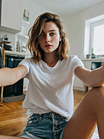 The collage-style fashion pieces floating in the first image hover briefly, then move toward the model one by one in a clear sequence. The first piece flies swiftly to the model; at impact, the surrounding space distorts slightly and the background stretches inward for an instant. A playful cartoon overlay—hand-drawn outlines, flat graphic shapes and sticker-like motion accents—flashes around the impact area for a split second. As the cartoon layer fades, a burst of expressive energy radiates out, with light motion lines and rhythmic pulses mirroring the model’s joy. The base clothing there vanishes instantly, and the floating piece attaches seamlessly to complete the change. This exact sequence—impact, subtle spatial distortion, brief cartoon overlay, emotional energy burst, clean replacement—repeats for every piece, with each transformation happening sequentially, never simultaneously. No extra pieces appear, and the total number of transformations matches the initial floating pieces exactly. Once the final piece fuses with the model, no clothing remains suspended, and she is fully dressed in the outfit made from the original floating collage pieces. The entire transformation is a continuous, magical yet realistic physical process with no cuts, jumps, edits or camera breaks. The scene then transitions smoothly to the second image, where the model poses confidently for the camera, smiling as she shows off the outfit with natural, lively movements. The whole sequence is a single uninterrupted shot: ultra-smooth, seamless and believable, like a real-world transformation blended with imagination.