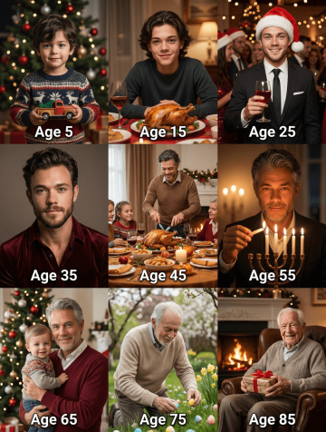A photorealistic 3x3 grid collage showing the lifecycle of a handsome man with dark wavy hair and warm eyes, celebrating various holidays throughout his life. Top Left (Age 5): A cute young boy in a knitted Christmas sweater holding a toy truck in front of a decorated tree. Top Middle (Age 15): A teenage boy with longer hair sitting at a festive dinner table, smiling. Top Right (Age 25): A young adult male in a suit wearing a Santa hat, holding a drink at a holiday party. Middle Left (Age 35): A stylish portrait of the man with a beard, wearing a burgundy velvet shirt, looking confident. Middle Center (Age 45): The man carving a turkey at a family Thanksgiving dinner. Middle Right (Age 55): The man with greying hair lighting a Menorah, looking dignified. Bottom Left (Age 65): The man with silver hair holding a grandchild in front of a Christmas tree. Bottom Center (Age 75): The elderly man outdoors in a spring setting, perhaps looking for Easter eggs, wearing a beige sweater. Bottom Right (Age 85): The very old man sitting in an armchair by a fireplace, holding a wrapped gift, looking happy. Style: Cinematic lighting, high resolution, 8k, highly detailed, ensuring the facial features remain recognizable as the same person aging naturally across all panels. Label each panel with white text at the bottom: 'Age 5', 'Age 15', etc