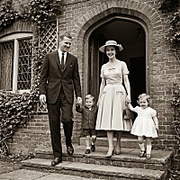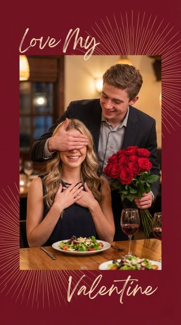 Wine red background. The photo is centered and aligned to the right edge. The top and left edges of the frame are decorated with extremely thin light golden sun-ray lines. In the top-left corner of the photo is the light beige handwritten English text "Love My", and at the bottom of the photo is "Valentine" in the same elegant, romantic font. The man is wearing a dark suit jacket and a light gray shirt, with a gentle smile. He gently covers the woman’s eyes with one hand and holds a full bouquet of red roses with the other. The woman has long wavy blonde hair and is dressed in a dark sleeveless top. She places both hands lightly on her chest, with a bright smile on her lips, her eyes full of anticipation and joy. The whole interaction is sweet and full of surprise. The background is a restaurant setting, with salads, wine glasses and tableware placed on the dining table.