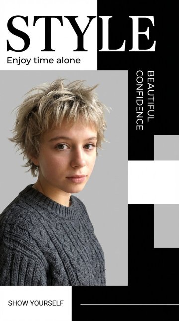 The image is dominated by black, white and gray, with only the figure retaining color. It combines modern minimalism and collage art, and the frame is divided by geometric color blocks. The photo is a close-up portrait in a 3:4 aspect ratio, taking up 35% of the frame. It is placed on the left side, with equal distance from the top and bottom edges. In the photo, the model has fresh and delicate makeup, with sharp and confident eyes looking directly at the camera. She wears a dark gray thick cable-knit sweater with clear fabric texture, standing sideways with relaxed and natural shoulder lines. The photo has a solid light gray rectangular background. At the top of the image is the large two-tone serif font "STYLE" — "STY" in black and "LE" in white, with the small black sans-serif text "Enjoy time alone" underneath. At the bottom left is the small black sans-serif text "SHOW YOURSELF", extended by a thin white line. On the upper right, the white sans-serif words "CONFIDENCE" and "BEAUTIFUL" are arranged vertically.