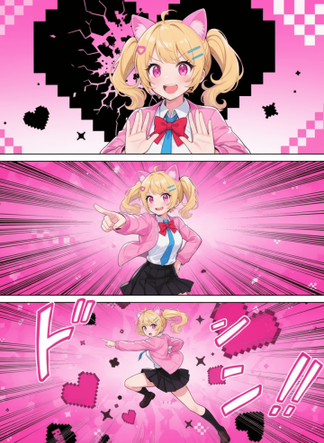 Generate a set of powerful 3-panel Japanese anime storyboards by referring to the image