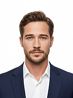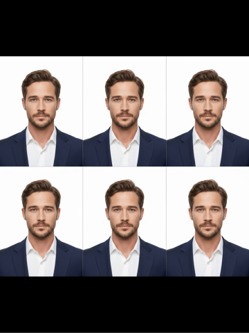 masterpiece, ultra-realistic ID photo, shoulders-up portrait of the same person, wearing a sharp navy-blue business suit and crisp white shirt, solid neutral background (#ffffff), soft even lighting, no shadows, face clearly visible, neutral expression, eyes straight at camera, ears visible, no glasses, smile, official ID photo dimensions 35 mm × 45 mm (413 × 531 px @ 300 dpi), passport-style framing.