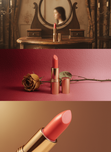 Use the lipstick from the uploaded reference exactly as it appears — keep color, shape, and details unchanged. Generate a vertical 4K (2160×3840) triptych: three equal horizontal panels forming one cohesive artistic story with the lipstick as the main subject. Overall Mood: Medieval European vintage cinematic atmosphere, warm caramel-brown and soft pink gradient tones, elegant and nostalgic, subtle analog film grain. Frame 1 – Distant Wide Shot with Mirror Reflection: Capped lipstick upright on a vintage vanity, viewed from far behind. Human side profile appears only in the mirror, small and highly blurred, keeping full attention on the lipstick. Warm diffused light highlights the lipstick; soft shadows create cinematic depth. Frame 2 – Mid-Shot on Fabric: Lipstick uncapped, standing upright on a soft gradient red-to-pink wool fabric, side view. A complete dried rose with stem lying on its side beside the lipstick. No cap visible. Soft light emphasizes texture of lipstick and fabric, creating a refined, retro feel. Frame 3 – Extreme Close-Up on Solid Background: Lipstick angled diagonally, tight focus on bullet showing velvet-cut surface and fine details. Background: warm solid color complementing lipstick tone. Directional warm light enhances texture, giving luxurious vintage cinematic quality. Technical & Style: Analog 35mm film style, ISO 400, f/2.8, soft film grain. Color palette: warm caramel-brown, soft pink, muted medieval tones. Output: authentic, artistic, vintage cinematic triptych, keeping the lipstick exactly as in the reference.