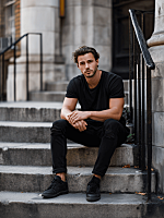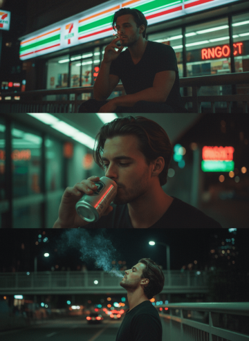 Wong Kar-wai's inspired cinematic triptych of a young man attached in the photo in the city at night, bathed in moody neon green, amber, and red lights. Film grain, dreamy haze, and soft blur with saturated colors. He has messy comma hair, parted to the side with strands falling across his forehead, giving a slightly disheveled, romantic look. keeping the original face. Top Panel: The man sits outside a late-night 7-Eleven with neon signs glowing behind him with the text "RNGOCT", holding a lit cigarette near his lips, his expression contemplative and distant. Middle Panel: He takes a slow sip from a canned beer bottle, his gaze unfocused as if lost in thought, neon reflections dancing across his face. Bottom Panel: He stands alone on a pedestrian overpass bridge at night, exhaling smoke from a cigarette, head tilted back toward the sky, expression weary and melancholic, blurred crowded people's headlights in the distance. Shallow depth of field, intimate close-up framing, nostalgic atmosphere.