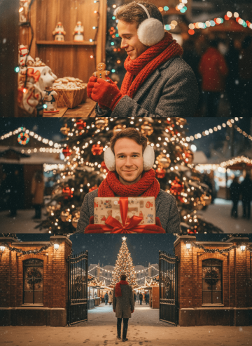Use the person from the uploaded photo exactly as they appear — keep original face, hair, and proportions unchanged. Create a vertical triptych with three equal horizontal panels, sweet, warm, cozy Christmas mood, gentle snowfall, soft warm lights, and subtle Kodak film grain. The subject wears a gray wool coat, red knitted scarf and gloves, and white fluffy earmuffs. Top Panel — Near Side-Profile, Sweet & Warm A near side-profile shot of the subject at a Christmas market stall. They hold a gingerbread man, smiling softly. Warm string lights form red-green festive bokeh; snow rests on hair. Textures of coat and scarf are visible; warm lighting enhances the sweetness. Middle Panel — Close-Up (Neck to Head), Looking at Camera A close-up from neck to head beside a decorated Christmas tree. The subject looks directly at the camera with a soft, sweet smile, holding a large wrapped Christmas gift in front of the chest to enrich the composition. Gold and red reflections from ornaments illuminate their face. Shallow depth of field keeps the subject crisp while background lights blur into warm film glow. Atmosphere: warm, festive, tender, joyful. Bottom Panel — Full Body, Night Market Entrance with Large Gates A full-body rear shot at night, with the subject walking toward the market entrance. The scene features large open iron gates occupying most of the frame, flanked by decorative walls extending to the edges. Inside, a huge glowing Christmas tree and warmly lit market stalls are clearly visible. Add colorful decorative lights, atmosphere lights, soft bokeh, lens flares, and gentle halation to enhance nighttime magic. Footprints trail behind; scarf sways lightly in the breeze. Mood: warm, inviting, magical. Technical Style Warm Christmas illumination blended with soft snow ambience. Kodak film grain, halation around highlights, natural glow, warm analog tones.