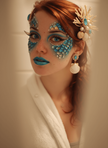 Use the same person, outfit, background, lighting, and facial features as in the reference image. Change only the makeup and accessories to a Halloween Siren/Sea Monster inspired look. Features: shimmering blue scales on the face and temples, subtle gradient blending toward the center of the face, sparkling metallic accents in gold and turquoise, dramatic ocean-inspired eye makeup, long exaggerated eyeliner resembling fins or waves, shimmering lips, mystical jewelry or shell-like adornments on the ears, small pearls and seashells as decorative accents, elegant and magical underwater theme.The person wears light blue contact lenses that make the eyes look enchanting and aquatic, small pearls placed under the eyes like mermaid tears, elegant hair accessories made of large jewels, shells, and coral, decorated with pearls and gemstones, creating a high-end fantasy deep-sea goddess style.
