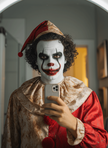 Use the person in the image. Keep the original face, features, expression, hairstyle, hair length, pose, gesture, lighting, and background exactly the same. Do not change the person’s gender or facial structure. Apply Art the Clown’s iconic makeup: pale white face, red exaggerated smile, mouth extended toward the ears with black thread strips attached along the mouth corners to mimic stitching, with dark red paint for a scab-like effect. Heavy black eye makeup with black tears running down, and a small black dot on the nose tip. Wearing a dirty, torn red-and-white harlequin clown suit with smudges, stains, and dust. A worn red-and-white clown hat on the head. The overall effect should look like a Halloween cosplay of Art the Clown, realistic, cinematic, and scary, but keeping the original person’s face and gender unchanged.