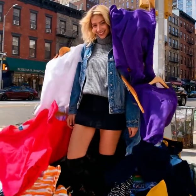 Fixed shot. The character remains still and looks directly at the camera without any other movements. (Over a thousand pieces) A large variety of different fashionable clothes (t-shirts, skirts, striped shirts, pants, fashionable clothing, etc.) fall rapidly from the sky and all hit the character (shoulders, head, arms), surrounding the character from front to back and left to right. The fabric of the clothes is smooth. The falling clothes seem to be able to bury the character (the character is exposed), and then they fall on the ground around the character. It's imaginative, interesting, or fashionable. Maintaining the consistency of the character, the character remains still.