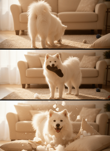 Use the animal in the uploaded reference image exactly as it appears — keep fur, color, proportions, and expression unchanged. Do not add or remove any animals. Generate a vertical 4K (2160×3840) triptych: three equal horizontal panels forming a cohesive story in a bright, sunny living room with warm golden-brown and cream tones, sofa, and rug. Frame 1 – Corner Observation (Far Back View) View from behind the animal, looking from its rear/hip area, showing its back as it curiously examines something on the floor in the corner. Not a side view. Warm sunlight streams softly, highlighting fur texture. Mood: gentle curiosity, playful and sweet. Frame 2 – Mischief in Action Side view, animal holds a slipper in its mouth, standing in the middle of the room. Sofa, rug, and scattered toys visible. Sunlight warms the scene, emphasizing fur and lively movement. Mood: happy, playful, mischievous. Frame 3 – Playful Dynamic Close-Up Close-up of the animal with joyful expression, surrounded by disheveled pillows and cotton stuffing. Add motion: animal mid-movement, fur slightly ruffled, cotton flying in the air. Warm sunlight highlights flying cotton and movement. Mood: energetic, cute, full of fun and liveliness. Technical & Style Vertical 4K frame, soft background focus, photorealistic textures, warm golden sunlight illuminating the scene. Output: cohesive vertical triptych capturing the animal’s curiosity, playful energy, and adorable personality, keeping the reference animal exactly as in the uploaded image.