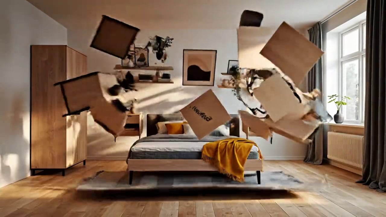 { "description": "Cinematic shot of a sunlit Scandinavian bedroom. A sealed InsMind box trembles, opens, and in a single continuous burst all flat pack furniture and decor assemble simultaneously into a fully finished, serene Scandinavian bedroom, highlighted by a yellow InsMind throw on the bed. No secondary assembly or additional elements appear afterward. No text.", "style": "cinematic", "camera": "fixed wide angle", "lighting": "natural warm with cool accents", "room": "Scandinavian bedroom", "elements": [ "InsMind box (logo visible)", "bed with yellow throw", "bedside tables", "lamps", "wardrobe", "shelves", "mirror", "art", "rug", "curtains", "reading chair", "plants" ], "motion": "box opens once; all furniture and decor assemble simultaneously in one continuous motion, then remain completely static", "ending": "calm, modern space fully assembled, no further motion or changes", "text": "none", "keywords": [ "16:9", "InsMind", "Scandinavian", "single assembly", "one-time build", "no secondary motion", "warm & cool tones" ] }