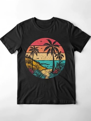 A black T-shirt with a colorful print in the middle, clothing design