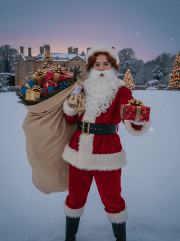 Modify this photo to maintain the consistency of the main subject. Keep the facial features and hairstyle of the characters unchanged. The character is wearing a red Christmas suit, with a coat featuring plush edges, and thick white plush decorations on the collar, cuffs, and hem. The lower part is red trousers with white plush edges on the cuffs. A black wide belt is tied around the waist, with a golden buckle. Black ankle boots are worn, and a white fake long beard of Santa Claus is attached. The head is wearing a red Christmas hat, revealing the original hairstyle. Character pose: Carrying a huge beige bag on the back, placed in the middle (larger than the character itself) of the bag, filled with beautifully packaged gift boxes (in various colors such as gold and red, with colorful bows), decorated with pine branches. This scene conveys the classic "Christmas gift-giving" scenario. Key pose: The right hand holds a gift box and extends it towards the camera. Scene: Winter snow scene, the ground is covered with snow, there are trees covered by snow in the distance, and a Christmas tree decorated with warm lights. The shot is taken in the early morning, shot size: Full body of the character, the effect of the iPhone shooting is casual, rich in color, with a retro tone, maintaining the original image size.