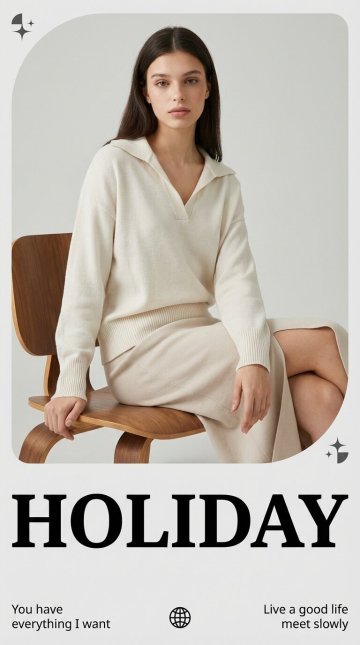 Overall in a minimalist modern style. The portrait is positioned in the upper part of the frame (occupying 60% of the image), with a light gray background behind the figure. The background has rounded corners on the diagonal, and a small inverse-color graphic decorates each blank diagonal area. At the bottom of the frame is the large bold black serif font “HOLIDAY”. Bottom left: “You have everything I want” Bottom right: “Live a good life meet slowly” A tiny black earth icon is placed in the middle of the bottom section. The model has fresh and refined makeup with natural lip color. Her gaze is calm and slightly distant, looking directly at the camera, exuding an elegant and high-end aura.She wears an off-white loose knit top with a wide lapel design, ribbed cuffs and hem. The fabric is soft and drapey, with a relaxed, comfortable fit. She pairs it with a matching light beige midi skirt with a side slit, revealing part of her leg line. The overall outfit is simple yet layered. She sits sideways on a wooden curved-edge chair in a relaxed and natural posture, one hand resting lightly on the chair, the other hanging naturally. Soft, even light falls on her clothing and skin, highlighting the delicate texture of the materials and the overall elegant atmosphere.
