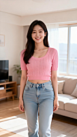 The collage-style fashion pieces floating in the first image hover briefly, then move toward the model one by one in a clear sequence. The first piece flies swiftly to the model; at impact, the surrounding space distorts slightly and the background stretches inward for an instant. A playful cartoon overlay—hand-drawn outlines, flat graphic shapes and sticker-like motion accents—flashes around the impact area for a split second. As the cartoon layer fades, a burst of expressive energy radiates out, with light motion lines and rhythmic pulses mirroring the model’s joy. The base clothing there vanishes instantly, and the floating piece attaches seamlessly to complete the change. This exact sequence—impact, subtle spatial distortion, brief cartoon overlay, emotional energy burst, clean replacement—repeats for every piece, with each transformation happening sequentially, never simultaneously. No extra pieces appear, and the total number of transformations matches the initial floating pieces exactly. Once the final piece fuses with the model, no clothing remains suspended, and she is fully dressed in the outfit made from the original floating collage pieces. The entire transformation is a continuous, magical yet realistic physical process with no cuts, jumps, edits or camera breaks. The scene then transitions smoothly to the second image, where the model poses confidently for the camera, smiling as she shows off the outfit with natural, lively movements. The whole sequence is a single uninterrupted shot: ultra-smooth, seamless and believable, like a real-world transformation blended with imagination.