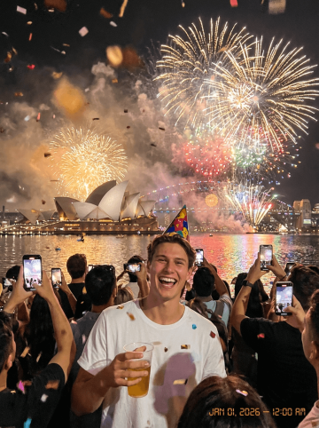 Create a photorealistic New Year’s Eve celebration photo featuring a man (use the uploaded face for 100% accurate facial reference) standing in a large crowd near Sydney Harbour. He is laughing brightly, holding a drink in one hand, wearing a colorful party hat, with confetti falling around him. His expression should be joyful and full of excitement. Behind him, show the Sydney Opera House, the Harbour Bridge, and a massive firework display lighting up the sky with gold, white, red, and multicolor bursts. The water should reflect the firework glow and city lights. Surround him with a dense crowd of people holding phones, capturing the moment. Add a warm, cinematic night-time atmosphere with bokeh lights and soft smoke from the fireworks. Include a small digital timestamp in the corner reading: “JAN 01, 2026 — 12:00 AM” to mimic a candid party-camera photo. The overall vibe should feel energetic, celebratory, and real — a perfect New Year’s countdown moment in Sydney.