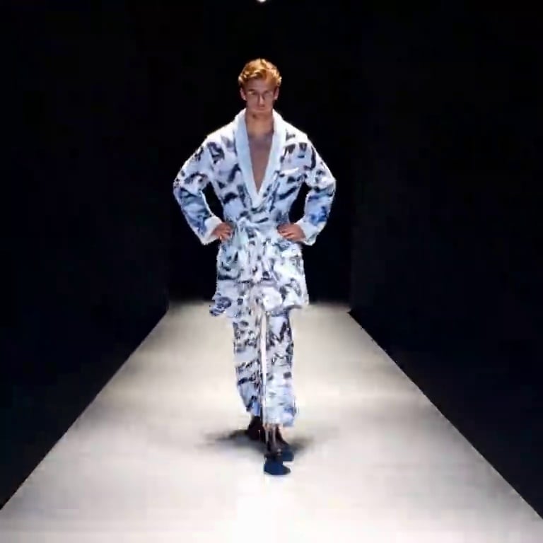 Maintain the consistency of the characters. The camera pulls back to shoot the full body from the front, with artificial lighting inside the studio. Follow the movement of the characters. After the character quickly stands up in 0.1 seconds, they take professional model steps, with a steady and rhythmic gait. The character has a cold expression on their face. At the moment they stand up, the background transforms into a fashionable catwalk (a white catwalk with a black environment and high contrast). The transition is seamlessly connected, with advanced lighting. The overall setting creates a professional and fashionable T-shirt show atmosphere, allowing the audience to feel the sophistication and dynamic charm of the fashion show. No transition.