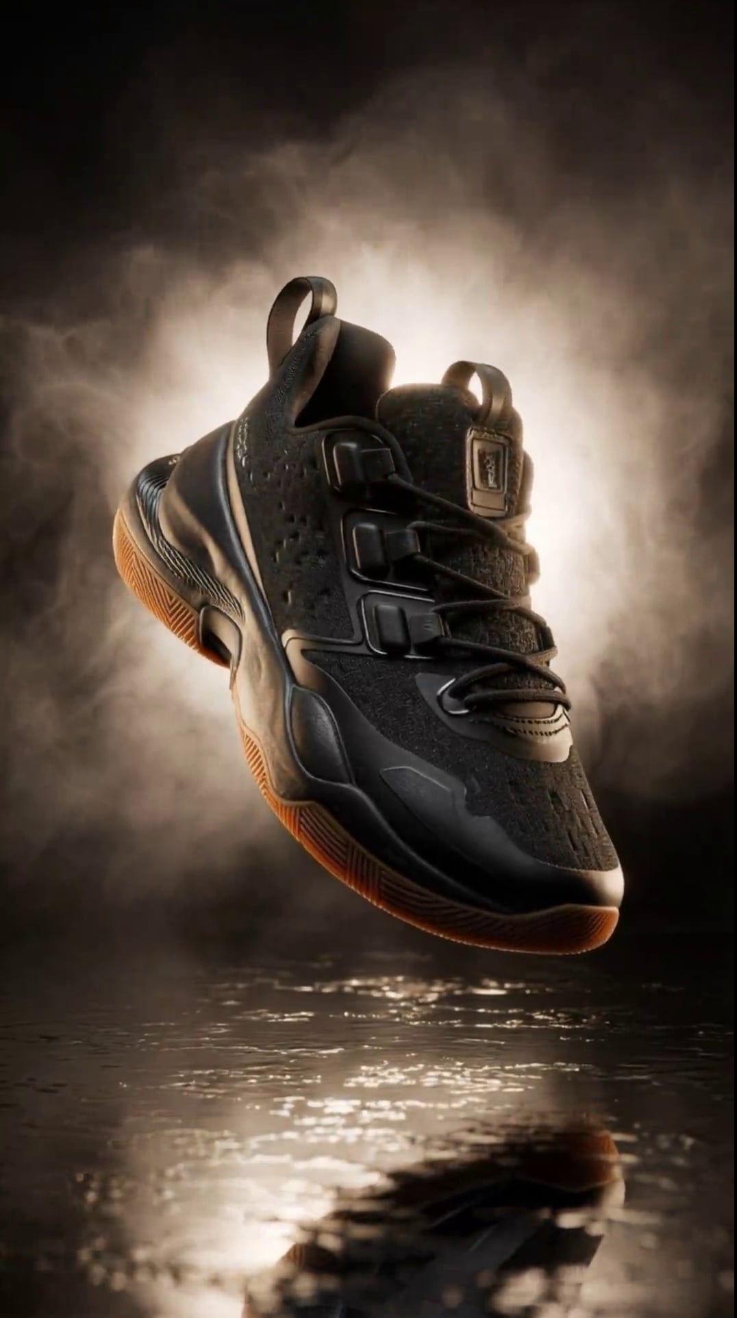 [{ "id": "Shot-1", "duration": "5 seconds", "camera": "Slow, smooth, continuous orbit around the fixed shoe at a very slow speed, maintaining a slightly low angle and medium shot.", "lighting": "Dramatic, high-contrast lighting with a strong backlight illuminating smoke and creating a halo effect. Frontal/side fill light on the shoe, with reflections on the wet surface below.", "subject": "A single sneaker (use the user-uploaded shoe) suspended in mid-air, gently hovering with soft, natural bobbing, slight rotation, and subtle drifting to simulate realistic floating in air.", "motion": "The shoe floats with smooth, rhythmic up-and-down motion combined with gentle, slow tilts and slight lateral drift. Movements have a natural inertia and easing, as if subtly responding to invisible air currents. Subtle, slow-moving smoke/fog drifts from the bottom upward." }]