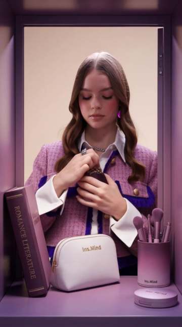 Use the lipstick from the uploaded reference exactly as it appears — keep color, shape, and details unchanged. Generate a vertical 4K (2160×3840) triptych: three equal horizontal panels forming one cohesive artistic story with the lipstick as the main subject. Overall Mood: Medieval European vintage cinematic atmosphere, warm caramel-brown and soft pink gradient tones, elegant and nostalgic, subtle analog film grain. Frame 1 – Distant Wide Shot with Mirror Reflection: Capped lipstick upright on a vintage vanity, viewed from far behind. Human side profile appears only in the mirror, small and highly blurred, keeping full attention on the lipstick. Warm diffused light highlights the lipstick; soft shadows create cinematic depth. Frame 2 – Mid-Shot on Fabric: Lipstick uncapped, standing upright on a soft gradient red-to-pink wool fabric, side view. A complete dried rose with stem lying on its side beside the lipstick. No cap visible. Soft light emphasizes texture of lipstick and fabric, creating a refined, retro feel. Frame 3 – Extreme Close-Up on Solid Background: Lipstick angled diagonally, tight focus on bullet showing velvet-cut surface and fine details. Background: warm solid color complementing lipstick tone. Directional warm light enhances texture, giving luxurious vintage cinematic quality. Technical & Style: Analog 35mm film style, ISO 400, f/2.8, soft film grain. Color palette: warm caramel-brown, soft pink, muted medieval tones. Output: authentic, artistic, vintage cinematic triptych, keeping the lipstick exactly as in the reference.