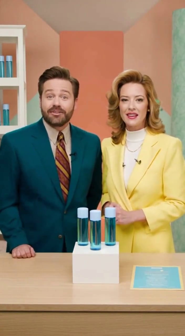 two hosts(a man and a woman) stand beside a display table, naturally interacting as they introduce the essence water product from the uploaded image. Full spoken lines delivered enthusiastically by the hosts (lines must be spoken, not on-screen text):“Guys, take a look! Your late-night lifesaver is here—our revitalizing essence water! Incredible repairing power, professionally formulated, and even safe for busy moms! Today only: buy two, get one free—just 50 sets left! Act fast or you’ll miss it!”