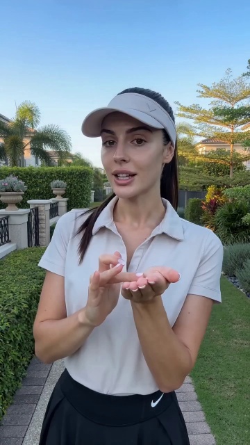 A vibrant young American woman, dressed in a simple and elegant light-colored short-sleeve top with a black sports skirt, a matching simple sun visor, and clean white sneakers, stands on a healthy trail in a villa neighborhood with soft morning light. She demonstrates the product to the camera in a natural, lively and energetic tone, squeezes some product onto her face, applies it, then leans closer to the camera to show the skin feel, saying: "My morning run must-have! This sunscreen sets in 1 second, feels light and non-sticky, SPF50+ keeps me safe from sunburn."